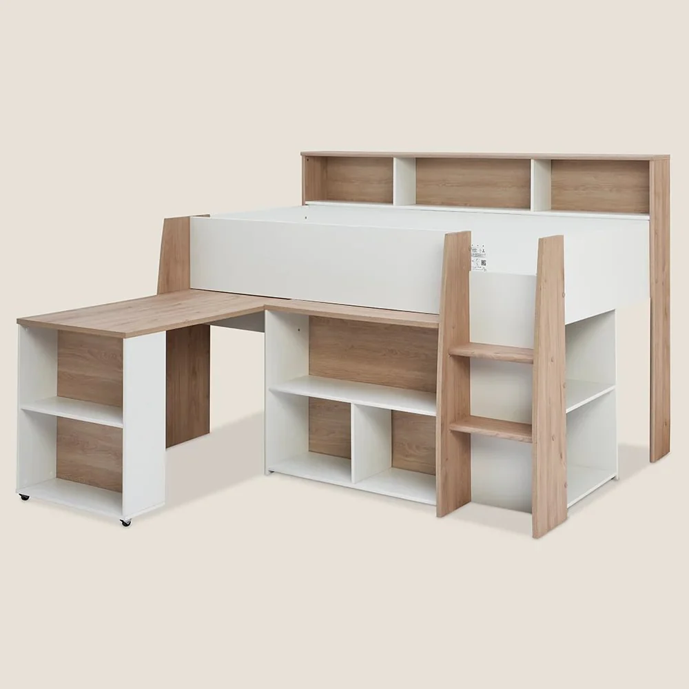 Our new stylish, space saving bed has plenty of practical features for your growing child. The mix of white and oak is effortlessly contemporary and sleek, perfect for lasting through all phases of childhood. With multiple storage and cubby holes to put clothes, books, you'll never run out of space. The handy desk pulls out for homework time, but pushes back in when relaxation is needed.